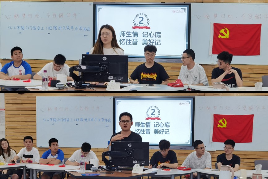 茶话会活动现场播放了学生们自己制作的毕业视频“青春心向党,建功新时代”。随着时间线的移动,让师生们一起重温似水年华里的点滴往事,带着曾经的感动和欣喜重新感受在川大化工中的每一份美好。随后,学生代表分别对四年关工委老教师跟班关爱进行有感发言。其中,韩鸿博同学谈到,“在跟班关爱的四年经历之中,与关工委老师一同举行了很多活动。从大一入学时的懵懂无知,到大四面临毕业时对未来的方向选择,从庆祝改革开放四十年到庆祝建国七十周年再到建党一百年,从老师的经历分享中体会到了国家发展历程的变化,也体会到了国家进步对于个人的影响,因此也坚定了将个人理想与国家民族前途命运相结合的决心”。此外,张菲依同学提到,“这四年来,每一次与关工委老师的活动都让我印象深刻,他们循循善诱的教导和不拘一格的思路给予我无尽的启迪,使我大学四年的时光变得充实而有意义。在迷茫时,老师们就是那一缕阳光,指引我前行的方向,让我在陷入焦灼状态时,能鼓起勇气,抬头仰望远处闪闪发亮的人生目标,鞭策着我克难求进,锐意进取,奋发努力……”