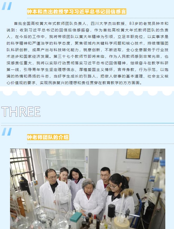 9月13日,学院微信平台推出“习近平总书记回信勉励全国高校黄大年式教师团队代表”主题推送。微信中,对习近平总书记对全国高校黄大年式团队教师代表回信全文内容进行了转载,并对全国首批黄大年式教师团队代表钟本和教授团队先进事迹进行了宣传。