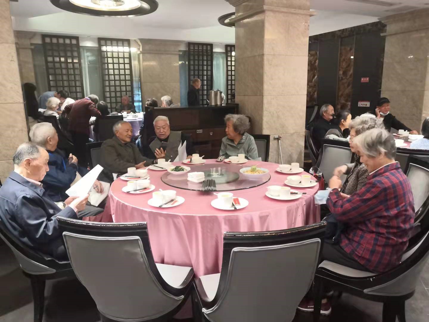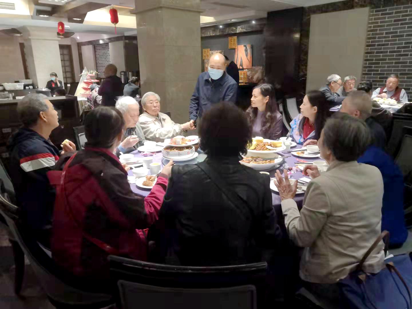 2021年10月13、14日中午,学院离退休教师在科华苑欢聚一堂,开展了重阳节活动。学院党委副书记兼纪委书记李天友来到现场,代表庞书记、赵院长向离退休老教师们送上亲切的问候和节日的祝福,并逐一关心老师们的生活和身体状况,了解他们对学校和学院工作的意见和建议。学院离退休工作联络员杨谨瑗向老教师们汇报了近期学校和学院的重要工作、今年活动费福利费的使用情况,以及老教师们关心的社保、养老、医疗等方面的新政策和新情况,并且针对每一位老师遇到的不同情况进行了耐心细致的解答。