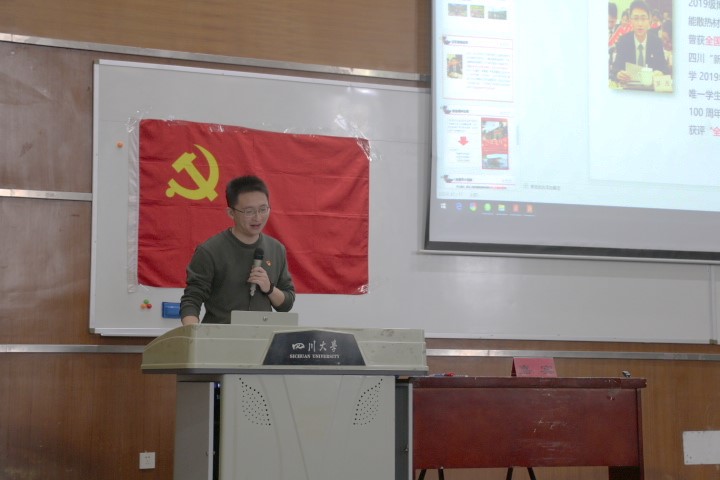 2019级博士研究生罗杰。与会嘉宾有辅导员老师李忆雯和雷金凤,团校及求是学堂的学员与本科社区党支部的同学共同参加了本次培训。