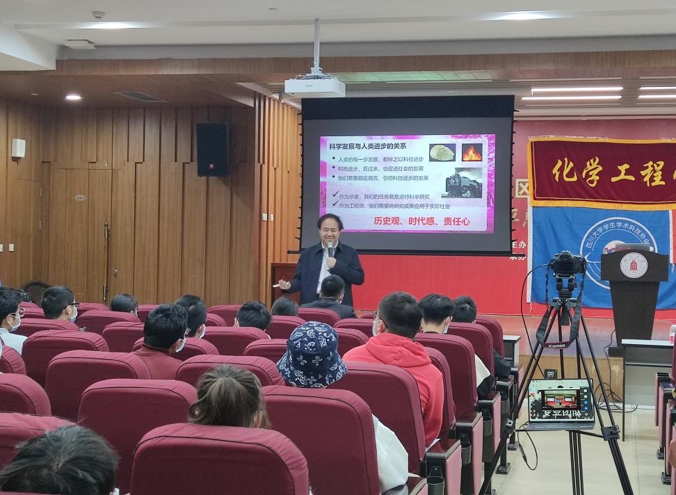 祝京旭教授从个人心得方面向同学们讲述科学发展与人类进步的关系,个人发展与时代和社会需求的关系,以及自身对科研的认识,使同学们对化工专业和工程师的社会责任都有了更深了解。在讲授过程中,祝教授为了带给同学们更多有关于科研初衷的思考,例举了许多日常生活中与科学研究有关的例子,提到“发现问题,解决问题”的科学初衷,也指出工程研究要接近生活。与此同时,祝京旭教授也分享了自己与科研项目的经历,生动形象,娓娓道来,进一步加深了同学们对化工领域的认识,鼓励大家学研究过程中要不忘初心,勤想问题,培养综合能力。在讲座最后,祝教授展示了自己生活中拍摄的照片,告诉同学们在学习生活中要找到自己的兴趣,兴趣是最好的源动力。