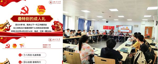 团委于2022年4月22日下午14:00,在江安校区一教D206,开展“最特别的成人礼”主题团日活动。本次活动邀请了学院党委副书记姜利寒老师,校院关工委离退休老教师梁明征老师、傅运清老师、傅师申老师、李川娜老师、刘蓉生老师、侯筑老师、徐怡老师,学院杨谨瑗老师。此外,2021级所有团员骨干以及本科社区党支部党员同学共计37名学生参与,本次活动由2021级辅导员李珍珍老师主持。