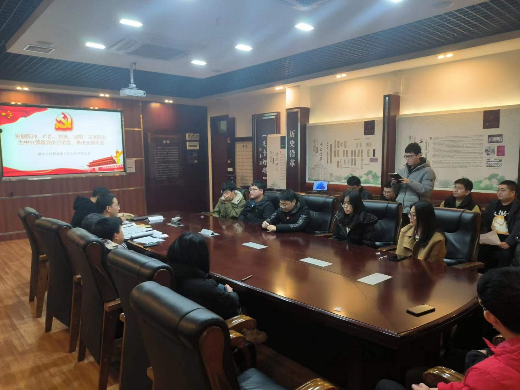 化工楼245会议室开展了将陈冲、卢凯、刘琳、邱阳和王尧同志发展为中共预备党员的支部大会,本次支部大会由支部书记邓松同志主持。