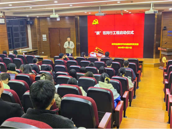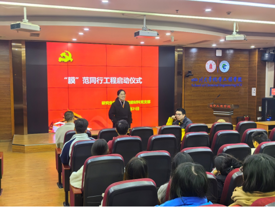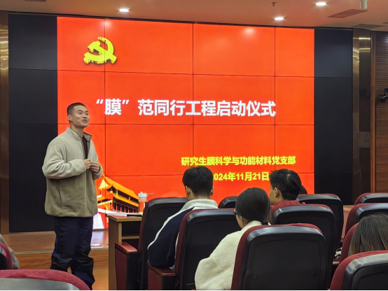 习近平总书记强调,推进国家治理体系和治理能力现代化,工作的基础在基层。将“品牌”理念引入基层党建工作,聚焦党建工作的重点难点,打造特色化党建品牌,为基层党建明确思路、目标和方向,是提升基层组织力的有益探索。为提高支部党建工作的针对性、打造具有鲜明“膜”范特色的科研与党建融合工程,膜科学与功能材料党支部于2024年11月21日晚在望江化工楼313室开展“膜范同行工程”党建品牌启动仪式。本次活动特别邀请学院副院长谢锐教授、化学工程系党支部书记汪伟教授共同参与。
