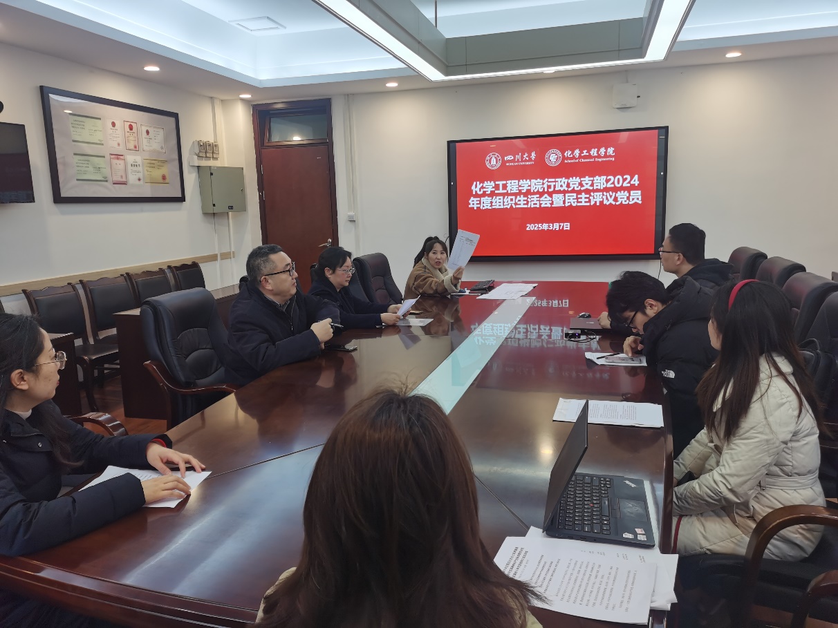 最后,全体支部党员一起开展了2024年度党支部组织生活会暨民主评议党员。行政及中心联合党支部书记高敏同志就党支部2024年度工作情况和取得的成效进行了总结,并提出了支部工作中还存在的突出问题及下一步的改进措施,提出支部将进一步持续加强学习,并结合管理和教辅人员的工作性质,创新支部组织生活方式,充分发挥党员的先锋模范作用,为高质量化工学院建设贡献力量。全体党员同志也对照党员义务,联系思想和工作实际,深刻反思了自己在“带头学习提高、带头服务师生、带头争创佳绩”等方面存在的问题和不足;并开展了党支部班子满意度测评和民主评议党员互评。