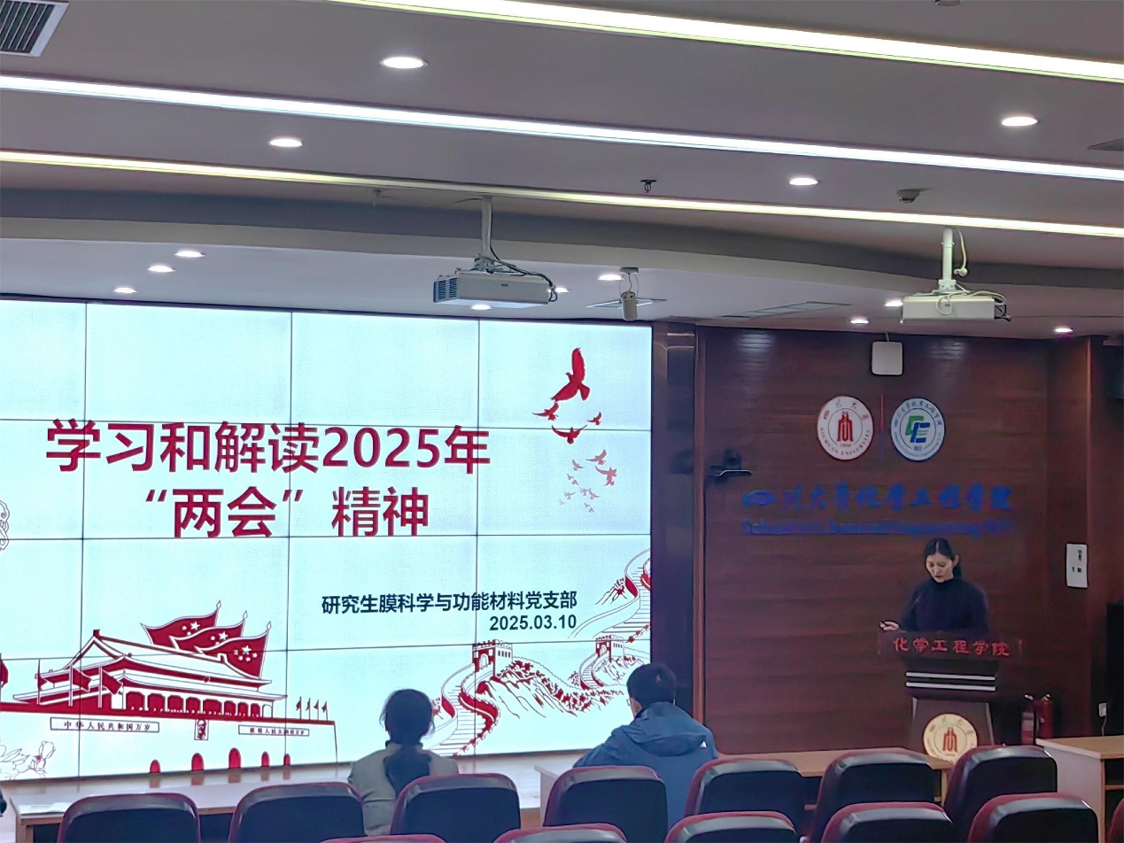2025年3月4日、5日,全国政协十四届三次会议、十四届全国人大三次会议在北京召开。习近平总书记在参加江苏代表团审议时强调,今年是“十四五”规划的收官之年,要牢牢把握高质量发展这个首要任务。为深入学习贯彻全国两会精神,提升支部党员同志的思想政治素养,同时结合我支部“膜”范同行工程品牌推动研究生事务管理高质量发展,丰拓党建品牌内涵,膜科学与功能材料党支部于2025年3月11日晚在望江化工楼313室开展学习全国两会精神暨 “膜”范同行工程助力研究生事务优化提升组织生活。本次活动特别邀请学院副院长谢锐教授、化学工程系党支部书记汪伟教授共同参与。