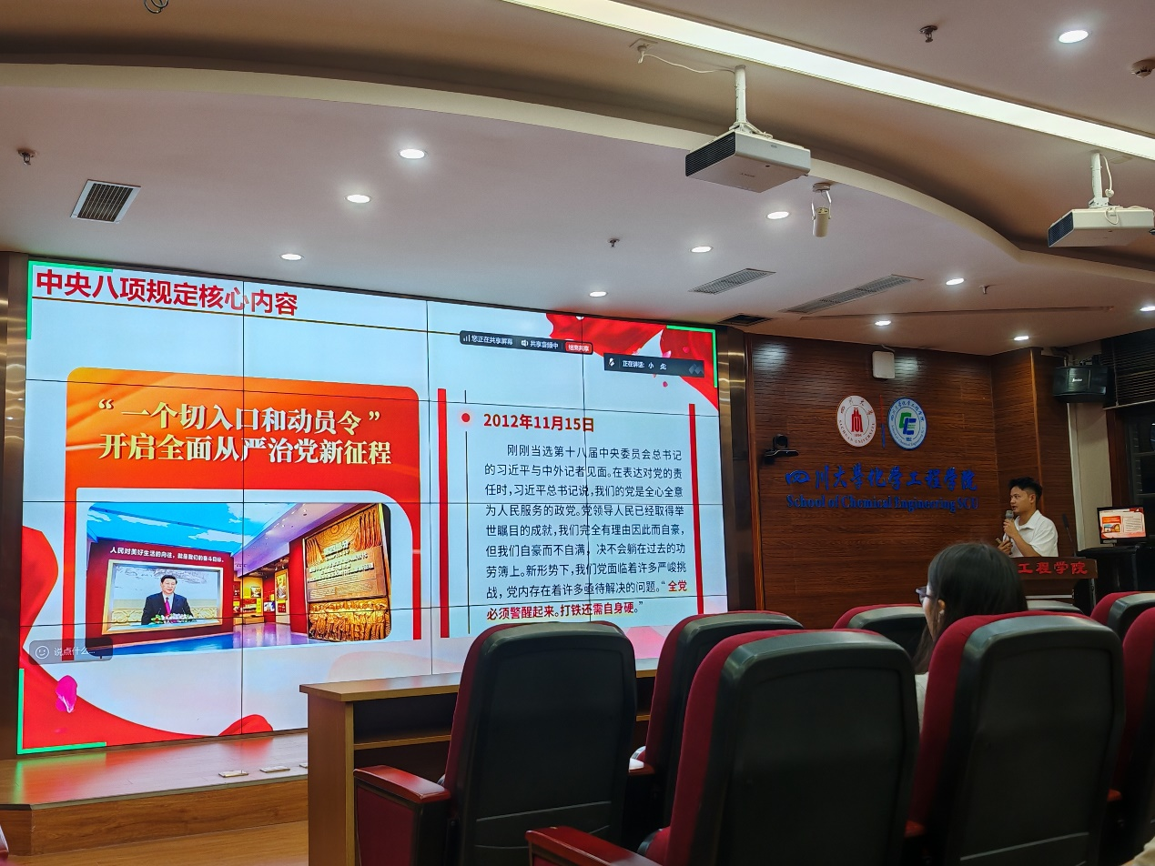 为深入贯彻中央八项规定精神,加强党支部作风建设,研究生膜科学与功能材料党支部于2025年9月25日晚在望江化工楼313室开展了深入贯彻中央八项规定精神教育总结会。会议由支部副书记夏有强主持。