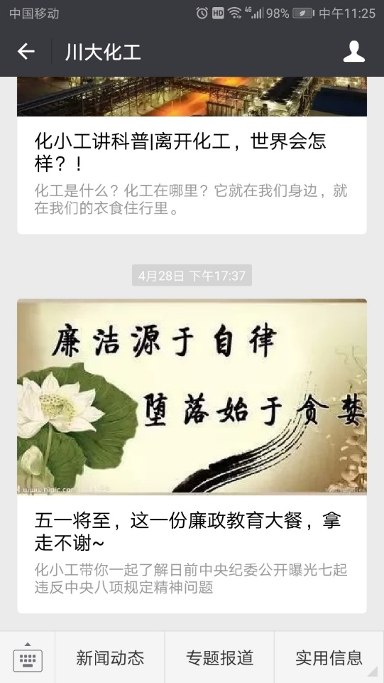 借助新媒体的宣传优势,学院微信平台“川大化工”推出“廉政教育”专题,全方位解读十九届中纪委二次会议精神、2018年教育系统全面从严治党工作视频会议要点等,利用学院微信平台发布学习信息,保证师生随时学习、及时学习,引导师生树立正确的纪律意识。