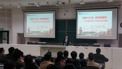 随后,刘吕红教授以“聚焦‘十三五’·谱写新篇章——学习领会党的十八届五中全会精神”为题,从“聚焦十三·五、‘十三五’具体内容与核心举措”两个方面,对五中全会精神作了深入解读。为了让全体师生更好地了解全会精神,刘教授首先给大家普及了党的代表大会、党的中央全会的划分标准、主要议题等相关背景知识。随后紧密联系我国建国以来的国内经济社会发展和制度文化变迁,分析了党的十八届五中全会的召开背景和重大意义。谈到五中全会的思想内涵,刘教授指出全会是在协调推进“四个全面”战略布局,全面建成小康社会决胜阶段召开的一次十分重要的会议,会议公报勾勒了未来5年中国经济、社会的发展蓝图,明确了改革的推进路径。最后,通过“小康社会”、“创新发展”、“协调发展”、“绿色发展”、“开放发展”、“共享发展”“二孩政策”、“加强党建”和“反腐斗争”十个关键词,刘教授联系当前经济社会发展实际,对公报内容进行了详细解读,尤其谈到创新发展、绿色发展的时候,特别结合化工学院教学科研工作,鼓励全体师生充分利用当前大科学工程的良好契机,利用学院的专业发展优势,争取在大环境下大有可为。