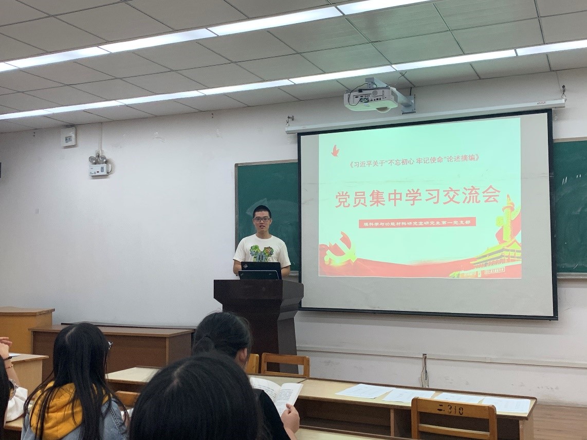 2019年11月8日,膜科学与功能材料研究室第一党支部书记文国宇同志带领全体党员同志在化工楼312会议室集中学习《习近平关于“不忘初心,牢记使命”论述摘编》,会上部分党员同志结合实际情况交流了学习心得。