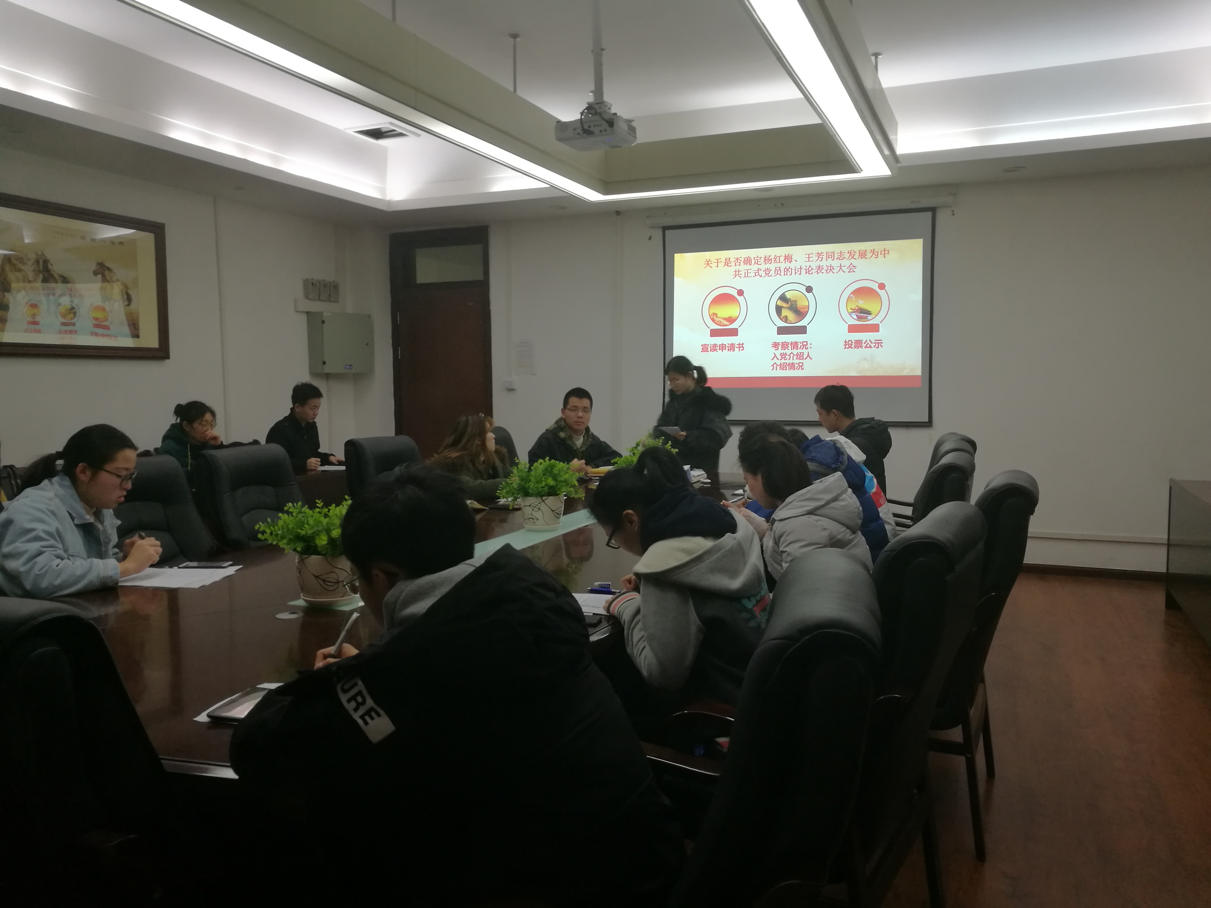 会议上,由组织委员闵瀚云同志点名,应到党员21人,实到党员16人,此次会议有效。随后,党支部书记刘郭洁同志对杨红梅以及王芳同志的情况做了一个简短的介绍,这两位同志也从思想上、工作上和学习上对自己在这一年的时间里向与会的党员同志做了一个总结性的汇报。蔡刚同志评价说:“杨红梅同志在平时的学习生活中是一个比较开朗热情的同志,思想觉悟上也比较端正,希望她以后能够继续坚持”。党支部副书记刘挺豪同志表示:“王芳同志不断加强政治理论学习,进一步提高了思想认识和政治觉悟。主动参加党支部组织的各项活动,表现积极”。党支部纪检委员高鹤同志主持投票表决,最终王红梅以及王芳同志全票通过表决,成为一名正式党员。