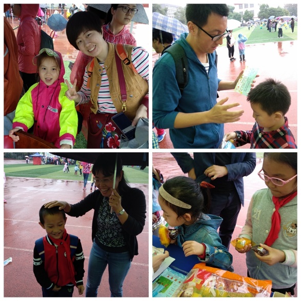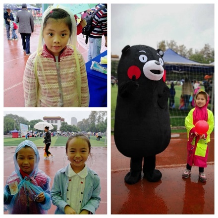 虽然现场风大雨大,但老师们和孩子们的运动热情丝毫没有减退。今年的活动现场还有两位小丑哥哥给大家现场发放气球。熊本熊、皮卡丘、小猪佩奇更是成为了孩子们争相合影的热门人物。现场欢声笑语不断,活动一直持续到晚上7点。
