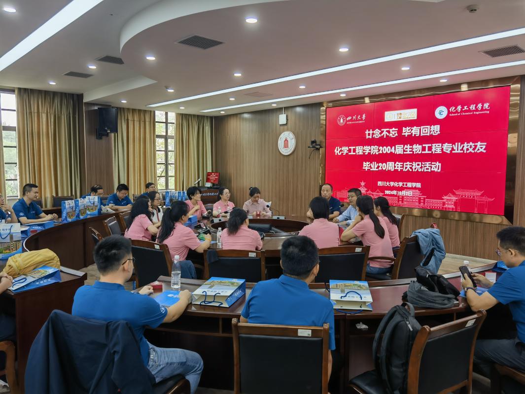 10月2日,学院2000级生物工程专业校友在望江校区化工学院312会议室举办了毕业20周年同学会。来自全国各地的40余位校友们齐聚一堂,共叙往昔,分享彼此的成长经历。校友在读期间的辅导员老师、校后勤保障部副部长范庆军、化工学院党委副书记兼纪委书记李德富和校友们一起参加返校活动。