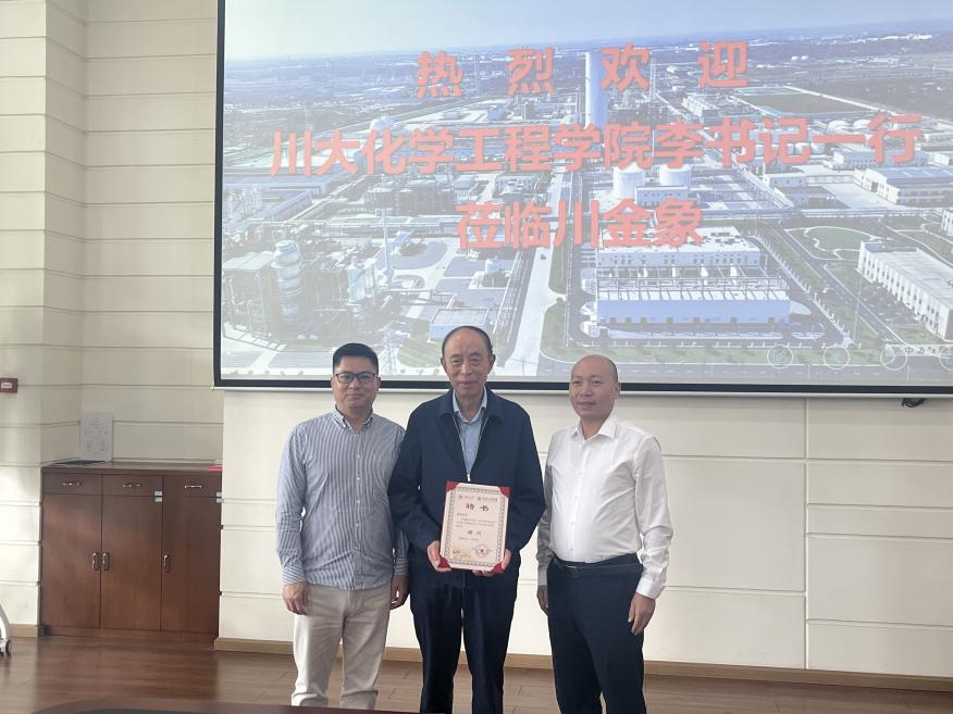 调研首站,学院一行到访四川金象化工产业集团股份有限公司。在1977届化工校友、董事长雷林的亲切陪同下,大家深入生产一线参观,并与公司管理技术骨干展开座谈。交流会上,李天友向雷林校友颁发了校友会顾问聘书。雷林深情回顾了在川大的求学时光,并表示将一如既往地支持母校发展,汇聚校友力量助推学院高质量发展。李天友书记对此表示衷心感谢,并指出学院将全力深化与川金象的产教融合,推动专项科研合作,破解产业难题。