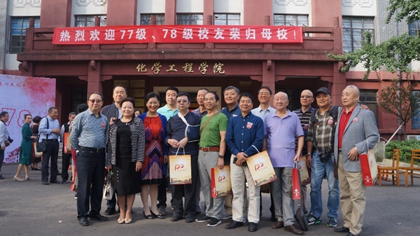 9月29日上午8:00,化工学院门口开始热闹起来,参加返校活动的77级、78级校友陆续报到。上午9:00,返校参加校庆活动的校友越来越多,化工楼前欢笑声此起彼伏,找到照片上的自己和曾经来一次世纪合影,找找曾经寝室的伙伴,看看你是否还是从前的模样。他们在这一天重回到川大,与老友重聚、与同窗叙旧、与母校同庆盛事,依然有着当年风华正茂的光彩。不管是哪一届的校友,在回到化工学院门前时都非常兴奋,脸上始终荡漾着笑容,他们重走当年走过的路,望着焕然一新的二教,欣赏着校园内陌生而又熟悉的一草一木,感慨万分。会务组的志愿者们以良好的精神风貌耐心地为重返母校的校友们解答各类问题,为他们讲解校庆期间的系列活动,讲述学院的现状和发展。一张张热情的笑脸,一句句亲切的问候,一项项贴心的服务,使整个签到工作进行得井然有序。