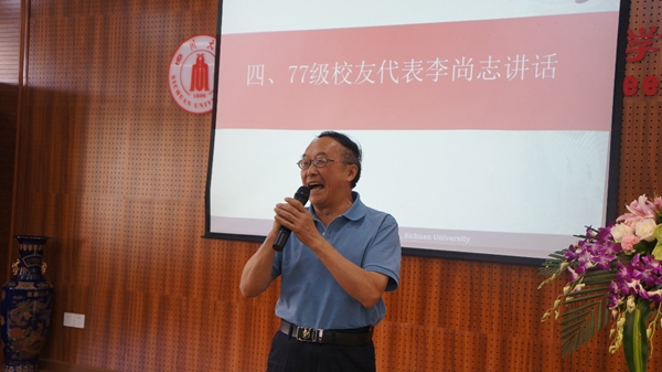 77级校友代表张富源则结合自己的工作和学习经历,表达了自己的感谢。感谢母校的老师,在他们人生最关键的时刻,不仅传授知识,更在做人做事方面给予指点、帮助。他表示,大家都为学院60年来的辉煌成就而感动,也期待着学院培养更多人才,造就更多大师,使他们更加感动。