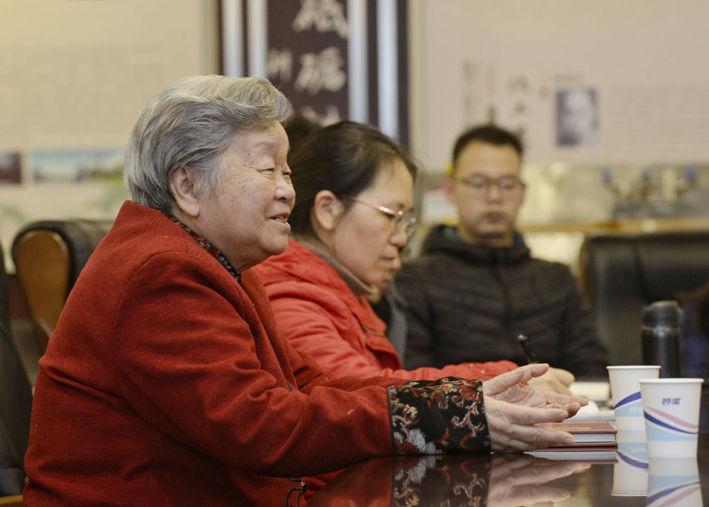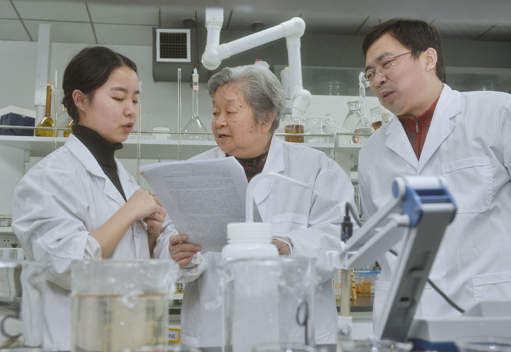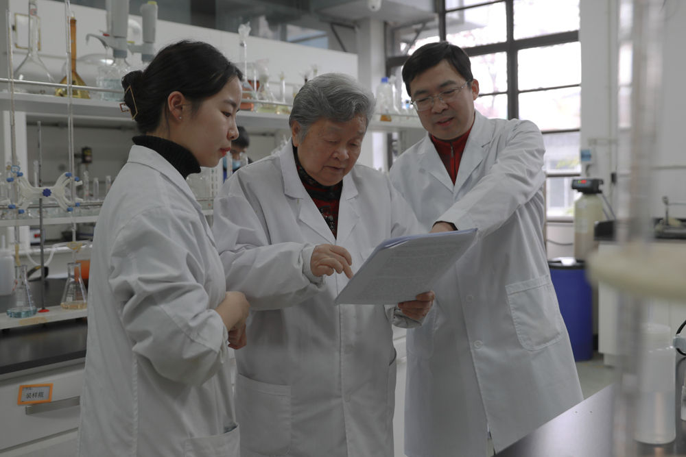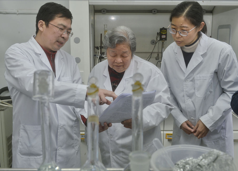 1月8日,钟本和(中)在制备分析室与团队教师讨论。