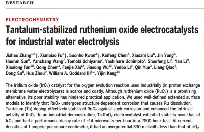In Collaboration with Prof. William A. Goddard at CalTech, Prof. Yijin Kang’s team at School of Chemical Engineering published their work regarding industrial water electrolysis entitled “Tantalum-stabilized ruthenium oxide electrocatalysts for industrial water electrolysis” in Science, on January 2nd, 2025.