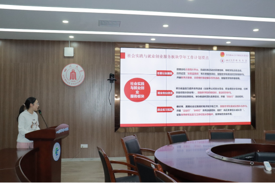 随后,校研会实践与就业创业中心主任团成员刘婕妤、郑悦欣、岳丹和方浩楠对本年度的实践与就业创业工作进行了全面而详细的介绍。他们分别从志愿公益服务、就业促进和政企实践实习三大板块展开,深入阐述了各项工作的具体内容和实施细则。在志愿公益服务方面,他们介绍了多项旨在提升学生社会责任感和实践能力的志愿活动;在就业促进方面,详细说明了各类就业指导和培训项目,帮助学生更好地适应职场需求;在政企实践实习方面,重点介绍了与政府和企业合作的实习项目,为学生提供了宝贵的实践机会和职业发展平台。通过这些介绍,大家对实践与就业创业中心的工作有了更深入的了解,也对未来的工作方向和目标有了更清晰的认识。