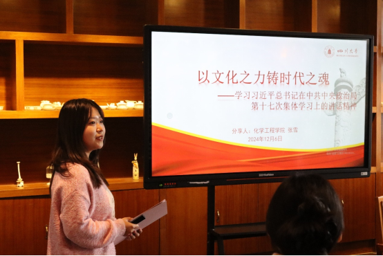 “青马工程”弘毅班、膜科学与功能材料党支部宣传委员张雪同志以“以文化之力铸时代之魂”为主题,引领全体同学深入学习习近平总书记在中共中央政治局第十七次集体学习上的重要讲话精神。张雪同志强调,作为新时代的青年,应以弘扬中华优秀传统文化为根基,加强理论武装,推动社会主义文化繁荣发展,用文化的力量铸就时代之魂。