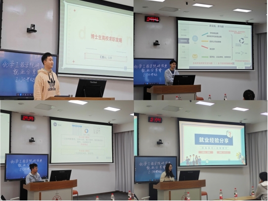 研究生分会于3月22日下午2:30在望江校区基础教学楼C座C102成功举办了研究生就业分享会。活动邀请张攀、马智林、匡霞、付潇四位2025届优秀毕业生代表,围绕高校教职、石油化工、新材料等领域进行经验分享,吸引了学院近百名硕博研究生踊跃参与。