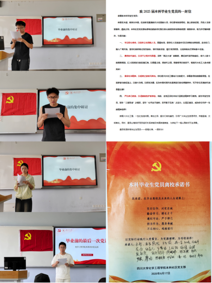 周一山领读本科社区党支部的《致2025届本科毕业生党员的一封信》。所有毕业生党员在《离校承诺书》中签名,以实际行动践行入党誓言,为党旗增辉,为母校添彩!