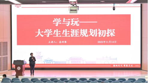 于11月14日13:50在江安校区水上报告厅举办洪沅讲堂“学与玩—大学生生涯规划初探”主题讲座。本次讲座由学院党委副书记姜利寒主讲,2025级学生张梓钰担任主持,辅导员李珍珍、付率以及2025级部分本科同学共同参与。