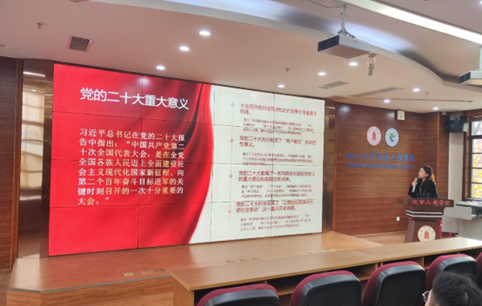 王思凡同学首先为与会成员阐述了活动开展目的并对活动主讲人进行了介绍,宣讲活动正式开始。首先上台的是2020级博士熊金衫,熊金衫系统介绍了我国我党近年来取得的建设成就,梳理解读了各个方面的重大部署,多角度强化了同学们对二十大精神和国家相关战略的认识,帮助同学们建立层次更加丰富的概念框架。