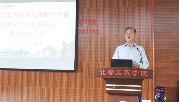最后,学院党委书记进行总结。他说到,今天的警示教育大会从财经政策、师德师风、学术诚信和安全管理等几个方面进行了教育提醒。希望学院全体教职员工能够以习近平新时代中国特色社会主义思想为指导,牢记高校立德树人使命,将党史学习教育与一流化工学科建设相结合、与一流化工创新人才培养相结合、与一流科技成果产出相结合,划定高校教师行为的红线和底线,强化对权力运行的制约和监督,为坚决打赢疫情防控阻击战,奋力推进中国特色、川大风格的世界一流大学建设和一流化工学科建设提供坚强保障。