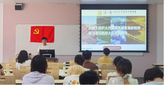 会议第二部分,学生党员进行主题领学。首先,田向民同志基于习近平总书记主持召开的新时代推动西部大开发座谈会,带领大家进行了以“创建大保护大开放高质量发展格局奋力谱写西部大开放新篇章”为题的深度学习。田向民同志主要就“什么是西部大开发”,“新时代西部大开放该如何作为”,“本次座谈会总书记做了哪些重要部署”这三个关键内容进行展开,带领党员同学领会西部大开发的重要性和必要性。