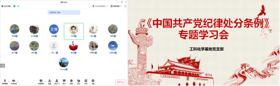 在党的二十大精神指引下,为进一步强化党员的纪律意识和规矩意识,提高党员队伍的整体素质,2024年5月23日,工科化学基地党支部进行了线上《中国共产党纪律处分条例》专题学习会。支部书记邓怡同志领学,全体党员积极参与,共同学习、交流与提高。
