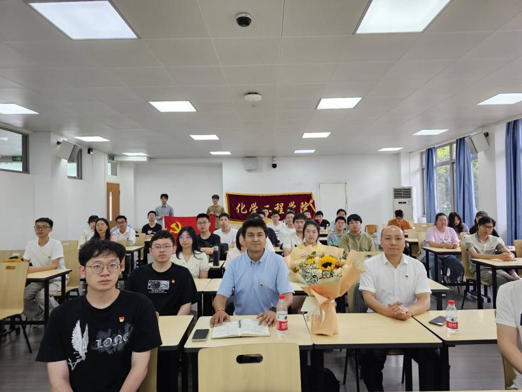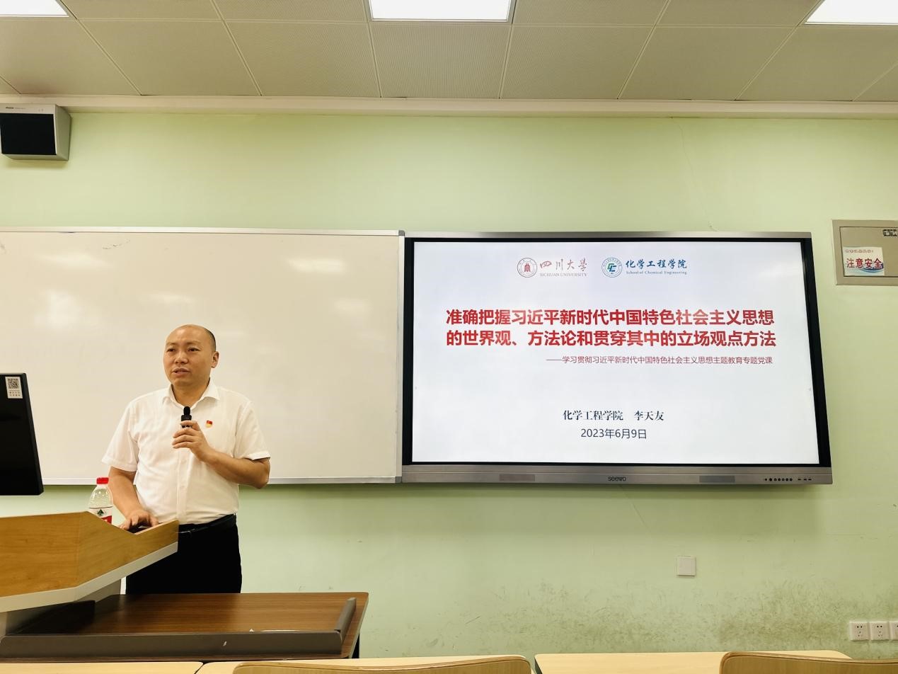 2023年6月9日上午9点,化工学院党委书记李天友、2019级本科党支部书记帕哈尔定以及40余名毕业生党员在江安一教D104室,开展学习贯彻习近平新时代中国特色社会主义思想主题教育,共话新时代青年党员的责任与奉献、使命与担当。李天友做了题为《准确把握习近平新时代中国特色社会主义思想的世界观、方法论和贯穿其中的立场观点方法》的专题授课。主题活动由支部委员赵铭宇主持。